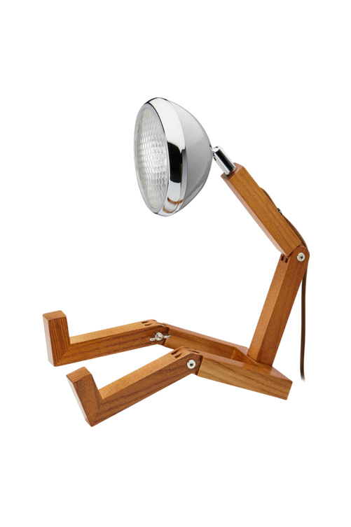 Bordslampa med design inspirerad av den ikoniska vespan och leksaksfigurer från 70-talet. Lampan är handgjord i vacker askträ. Den kraftfulla led-glödlampan lyser upp ordentligt och de 139 glasbubblorna på strålkastaren skapar en skön stämning. Lampan kan tippa om den ställs i upprätt läge. Lampan är designad att vara i sittande position. För stående position behövs lampstativ från piffany copenhagen. Mått: b 15,5 cm, d 27,6 cm, h 18-40 cm inkl 2,3 m lång bomullssladd(brun), samt en 12v g4 led glödlampa (2,5w). Adapter för stickkontakt eu och uk medföljer. Lumen 200 lm. Input voltage 100v-240v ac. Color temperature 2700 k. Color rendering(ra) >80 life expactancy 25.000 hr material: askträ/aluminium/metall