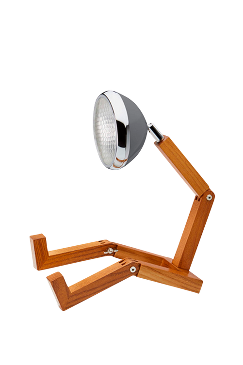 Bordslampa med design inspirerad av den ikoniska vespan och leksaksfigurer från 70-talet. Lampan är handgjord i vacker askträ. Den kraftfulla led-glödlampan lyser upp ordentligt och de 139 glasbubblorna på strålkastaren skapar en skön stämning. Lampan kan tippa om den ställs i upprätt läge. Lampan är designad att vara i sittande position. För stående position behövs lampstativ från piffany copenhagen. Mått: b 15,5 cm, d 27,6 cm, h 18-40 cm inkl 2,3 m lång bomullssladd(brun), samt en 12v g4 led glödlampa (2,5w). Adapter för stickkontakt eu och uk medföljer. Lumen 200 lm. Input voltage 100v-240v ac. Color temperature 2700 k. Color rendering(ra) >80 life expactancy 25.000 hr material: askträ/aluminium/metall
