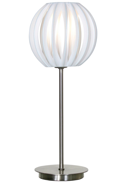 Bordslampa Plastband, gjord av vita plastband virade runt metallstomme, pinnfot i krom. Diameter 15 cm Höjd 38 cm. Lamphållare E14 Max 25W.