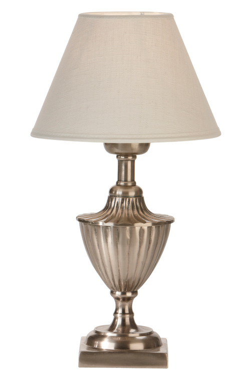 Lampfot i metall, antiksilver höjd 24 cm, bredd 8 cm. E27, max 40 w. 1,8 meter kabel med brytare. Skärm Royal, diameter 16/8 cm, höjd 10,5 cm. Vit laminerad linnetyg. Total höjd 30 cm.