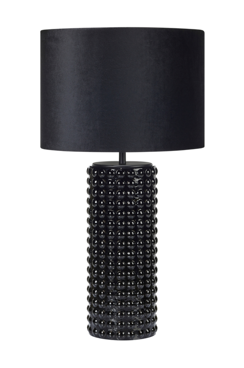 Stor bordslampa med svart fot i glas och svart textilskärm. 63,5cm hög och skärmens diameter 34cm. 2m kabel med strömbrytare på sladden. Max 1x60W. E27-sockel.