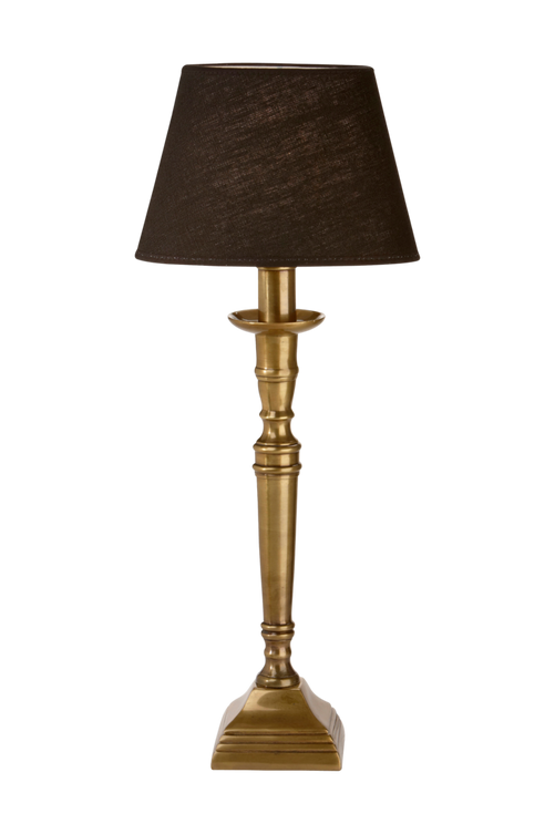 Lampfot i metall, antikmässing. Höjd 53 cm, bredd 11 cm. 1,8 m anslutningskabel med strömbrytare. E27, max 40 w. Skärm Oval, diameter 25/15 cm , höjd 17,5 cm. Svart laminerat linnetyg. Total höjd 63 cm.