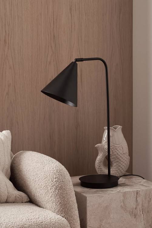 Bordslampa av metall med trendriktig, konformad skärm. Skärmen är justerbar i höjd- och sidled. Sladd med strömbrytare. Skärmens mått: Diameter 18 cm x höjd 20 cm. Lampfotens diameter: 18 cm. Ljuskälla ingår ej.