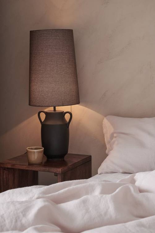 Bordslampa med fot av keramik i matt svart finish och hög skärm i grövre bomullstyg. Mått på skärmen: Höjd 43 cm, topp diameter 25 cm, botten diameter 30 cm. Mått på lampfoten: Höjd 28 cm, diameter som störst ca 21 cm. Svart textilsladd med strömbrytare. Ljuskälla ingår ej.