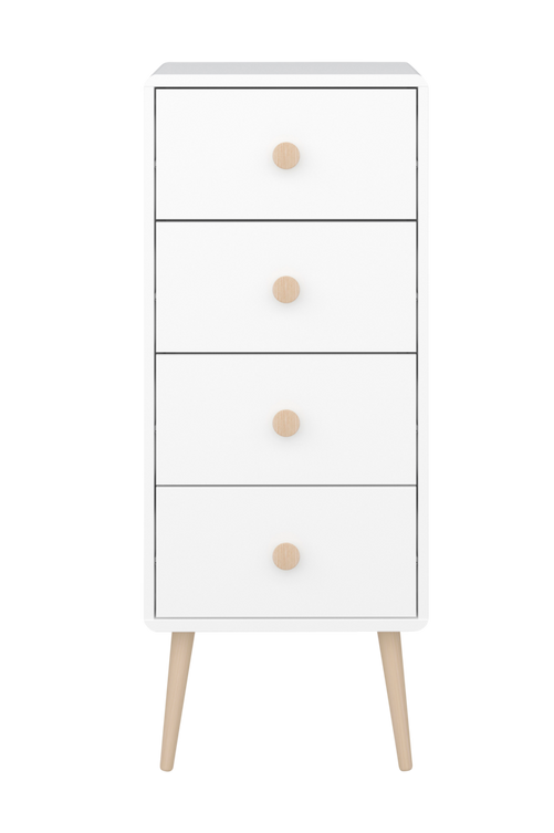 Smal byrå med 4 lådor. Tillverkad i MDF med lackerad yta och handtag / ben i massiv obehandlad ek. Enkel självmontering.