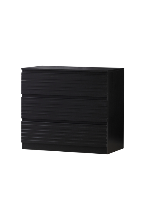 En enkel byrå med präglat mönster på lådorna Tillverkad av FSC-certifierad furu med matt, svart beläggning Med ett säkert, mjukstängande system H 75 x B 83 x D 46 cm Jente byrå med lådor är ett måste för alla samlare. Denna stora byrå med lådor ingår i en kollektion från det nederländska märket WOOOD och ger mer än tillräckligt med dolt förvaringsutrymme med sina tre lådor. Jente byrå är tillverkad av robust, FSC-certifierad furu och har en djup, svart finish. De tre lådorna har ett tyst, mjukstängande system och osynligt handtag. Jente byrå är 75 cm hög, 83 cm bred och 46 cm djup. De tre lådorna har alla måtten H 20 x B 83 cm. Lådornas invändiga mått är H 15 x B 76 x D 38 cm. Jente byrå från WOOOD levereras omonterad med enkla monteringsanvisningar. För att skydda hårda golv, sätt möbeltassar av filt på undersidan.
