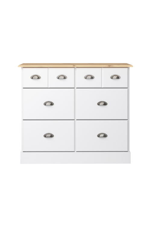 Byrå med sockel och 4 stora / 2 mindre lådor. Tillverkad i lackerad MDF med topp i massiv tall i en färgad och lackerad yta. Enkel självmontering.