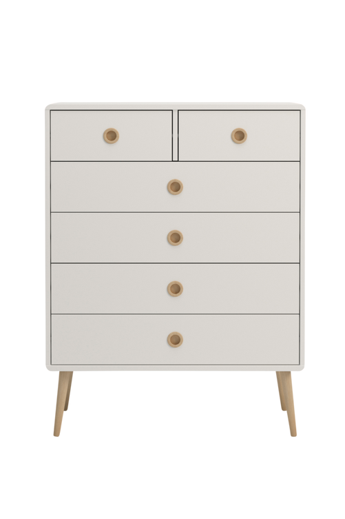 Funktionell Byrå med 4 stora och 2 små lådor för förvaring. Tillverkad i lackerad MDF och massiv ekhandtag och ben. Enkel självmontering.