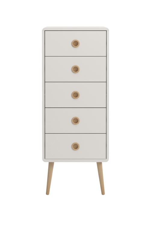 Byrå med 5 lådor för förvaring. Tillverkad i lackerad MDF och massiv ekhandtag och ben. Enkel självmontering.