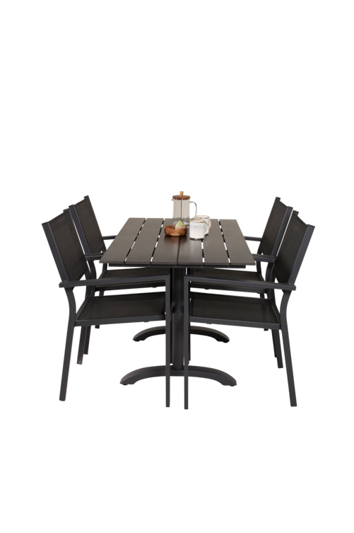 Delta cafébord med en topp i svart aintwood och svarta bordsben i aluminium. Bordets mått: Längd: 120cm, Bredd: 70cm, Höjd: 74cm. Matchas med 4st stapelbara Cassie matstolar i textilene och stolsben i aluminium. Stolens mått: Totalhöjd: 88cm, Bredd: 50cm, Djup: 44cm, Sitthöjd: 43cm. Bord och stol kräver enklare montering.