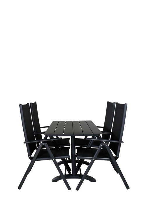 Denver cafégrupp med en bordstopp i aintwood och bordsben i aluminium. Matchas med 4st Break 5 positionsstolar med stolsits i textilene och stolsben i aluminium. Bord och stol kräver enklare montering. Bordets mått: Längd: 120 cm, bredd: 69 cm, höjd: 72 cm. Stolens mått: Sittbredd: 45 cm, sittdjup: 43 cm, sitthöjd: 44 cm.