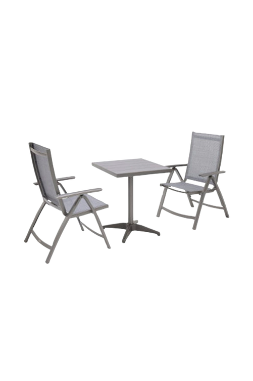 Caféset som är perfekt för små utrymmen med 2 positionsstolar. Stolar och sidobord av aluminium med bordsskivan Isotop. Bord med självjusterande fot – perfekt för ojämna golv. 100% underhållsfri. För 2 personer.