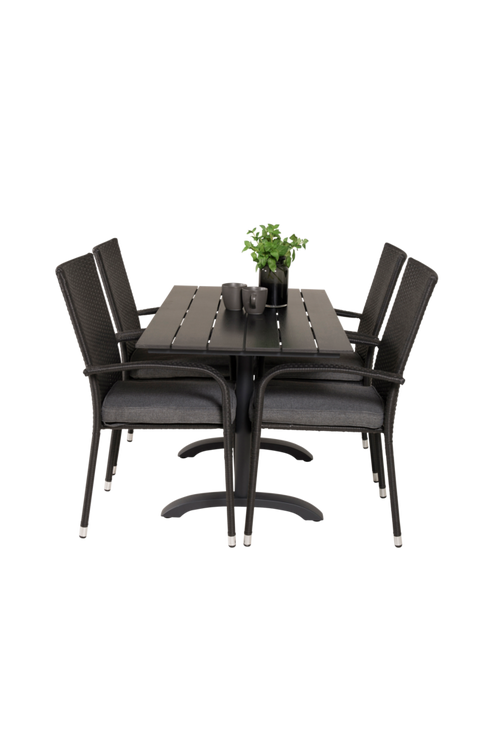 Delta cafébord med en topp i aintwood och bordsben i aluminium. Bordets mått: Längd: 120cm, Bredd: 70cm, Höjd: 74cm. Matchas med 4st stapelbara Astrid matstolar med stolsben i stål. Stolens mått: Totalhöjd: 96cm, Bredd: 45cm, Djup: 47cm, Sitthöjd: 44cm. Bord och stol kräver enklare montering.