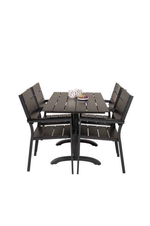 Delta cafébord med en topp i aintwood och bordsben i aluminium. Bordets mått: Längd: 120cm, Bredd: 70cm, Höjd: 74cm. Matchas med 4st stapelbara Louis matstolar i aintwood och stolsben i aluminium. Stolens mått: Totalhöjd: 89cm, Bredd: 42,7cm, Djup: 45,5cm, Sitthöjd: 41cm. Bord och stol kräver enklare montering.