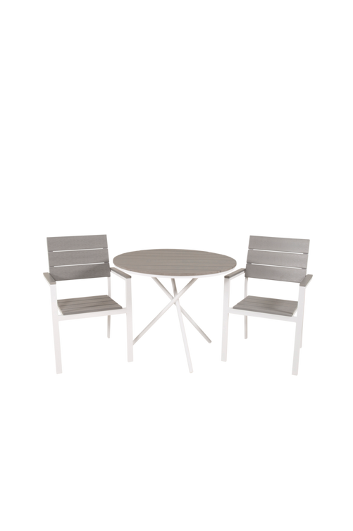 Pascal cafébord med en rund topp i aintwood och bordsben i aluminium. Bordets mått: Diameter: 90cm, Höjd: 74cm. Matchas med 2st stapelbara Louis matstolar i aintwood och stolsben i aluminium. Stolens mått: Totalhöjd: 89cm, Bredd: 41cm, Djup: 45,5cm, Sitthöjd: 42,7cm. Bord och stol kräver enklare montering.