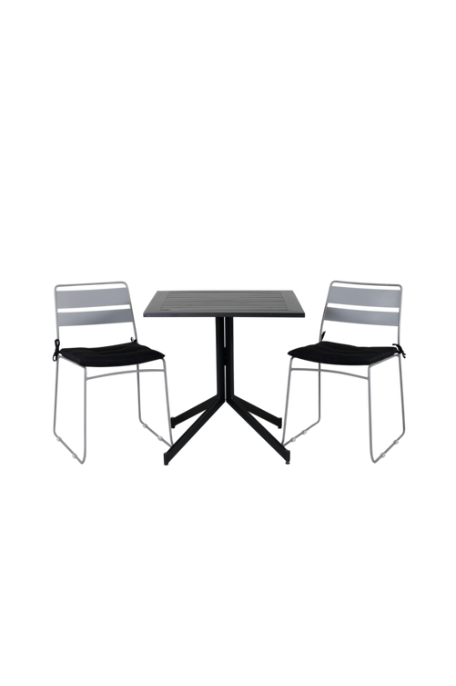 Walter matgrupp med en bordstopp i aluminium och bordsben i aluminium. Matchas med 2 st Lincoln matstolar med stolsits i stål med sittdyna och stoldsben i stål. Bord och stol kräver enklare montering. Bordets mått: Längd: 70 cm, Bredd: 70 cm, Höjd: 72 cm. Stolens mått: Sittdjup: 42.5 cm, Sittbredd: 39 cm, Sitthöjd: 47 cm.