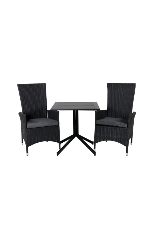Walter matgrupp med en bordstopp i aluminium och bordsben i aluminium. Matchas med 2 st Prim fällbara matstolar med stolsits i rotting med sittdyna i polyester och stoldsben i aluminium. Bord och stol kräver enklare montering. Bordets mått: Längd: 70 cm, Bredd: 70 cm, Höjd: 72 cm. Stolens mått: Sittdjup: 47 cm, Sittbredd: 48 cm, Sitthöjd: 42.5 cm.