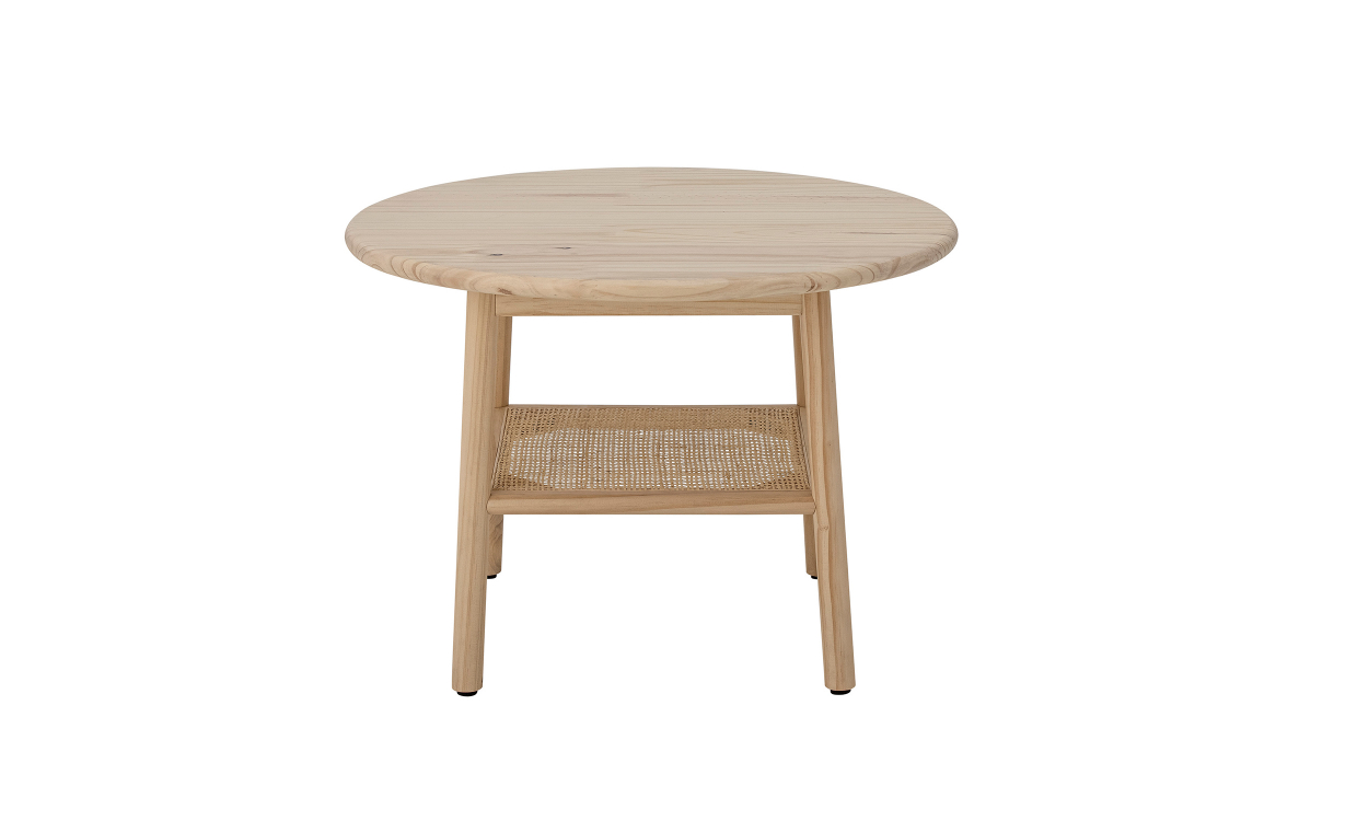 Ett runt soffbord tillverkat i tall som fått behålla sin naturliga färg. Camma är ett stilrent bord i nordisk design som passar i alla hem. För extra förvaringsmöjligheter finner du nertill även ett hyllplan i rotting. Design & egenskaperRunt soffbord tillverkat i tall.Torkas av med fuktig trasa.Hyllplanet är placerat 17 cm från marken. Leverans & förpackningAntal förpackningar: 1 stFörpackningsmått: 12x67x63 cmVikt: 8 kg