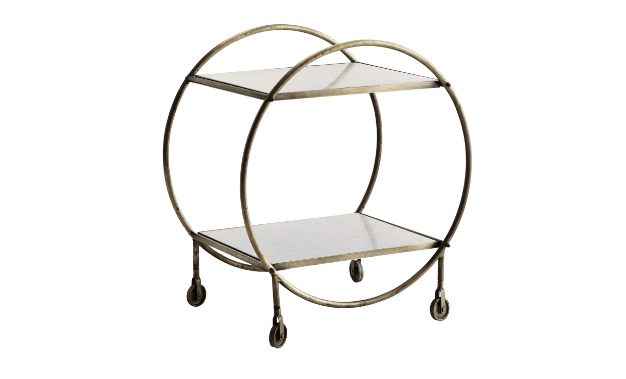 En exklusiv och härlig serveringsvagn från Madam Stoltz. Vagnen är tillverkad med kärlek och har en antik look av mässing i järn och hyllorna är av vit marmor. Då marmor är ett naturmaterial kan det skifta lite i färg och nyans. En serveringsvagn för finsmakaren. Carlton är inte gjord för att köras runt med utan har hjul för dess design.