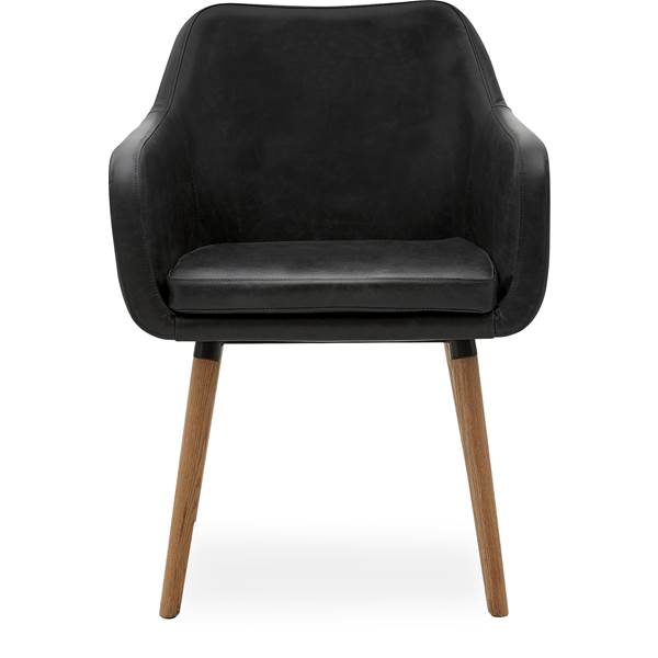 matstol, maxbelastning 120 kg och siddehøjde 49 cm. – sits i svart vintage konstläder och ben i oljebehandlad ek