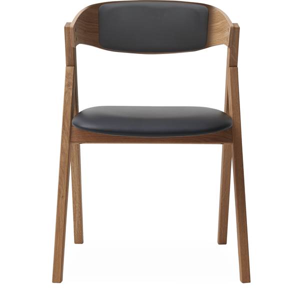 matstol, med armstöd, med vadderat ryggstöd, maxbelastning 120 kg och siddehøjde 45 cm. – Sits och rygg i svart läder och stomme i oljad, massiv ek