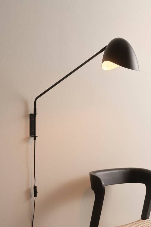 Vägglampa i metall, skärmen har blank, vit insida som reflekterar ljuset fint. Den asymmetriska skärmen är riktbar. Sladd av plast med EU-anpassad kontakt och strömbrytare på sladden. Lampan är ojordad, klass 2. Material: Metall och plast. Storlek: Höjd 54 cm, längd 64 cm, bredd 19 cm. Armlängd 49 cm. Skärm höjd 18,2 cm, ø 19,52 cm. Väggfäste längd 12 cm. Sockel/lampa: 1 st E14, max 25 w glödlampa. Ljuskälla medföljer ej. Tips/råd: En vägglampa har många användningsområden och placerar du CLEO med lite fantasi kan du ge rummet en helt ny look.