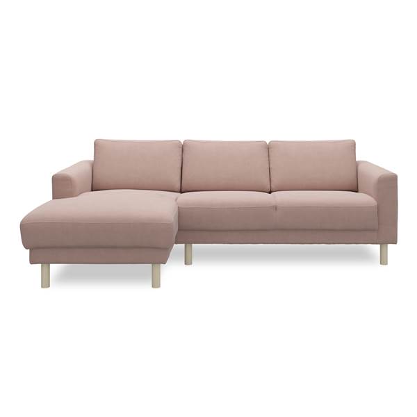3 sits vänstervänd Soffa med schäslong, inkl. ben, siddehøjde 47 cm, exklusive nackstöd. – Soft 452 Rose tyg, ben i vitoljad furu och sits: polyeterskum rygg: polyeterskum