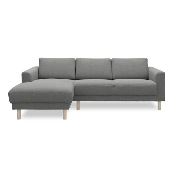 3 sits vänstervänd Soffa med schäslong, inkl. ben, siddehøjde 47 cm, exklusive nackstöd. – Soft 450 Grey tyg, ben i vitoljad furu och sits: polyeterskum rygg: polyeterskum