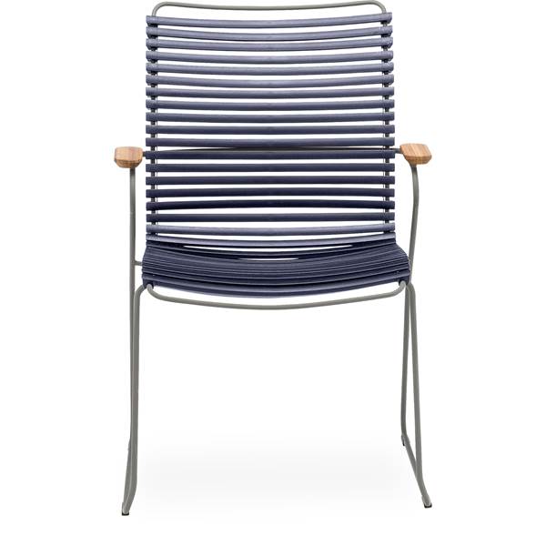 Hög Trädgårdsstol, med armstöd, exkl. dyna, maxbelastning 110 kg och siddehøjde 45 cm, stapelbar. – Mörblå plastlameller fv 91, stomme i stålgrå metall och armstöd i bambu