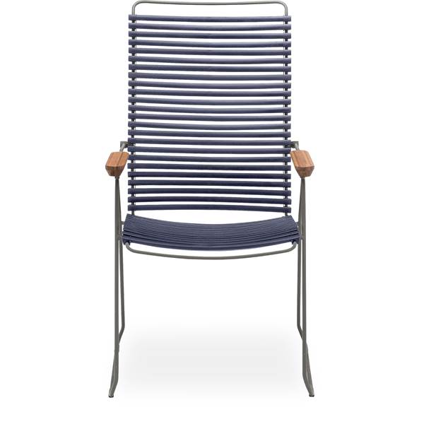 Positionsstol, maxbelastning 110 kg och siddehøjde 45 cm, ej stapelbar. – Mörblå plastlameller fv 91, stomme i stålgrå metall och armstöd i bambu