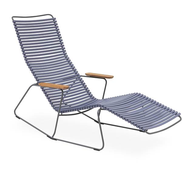 Sunrocker, siddehøjde . – Matta blåa plastlameller fv 82, stomme i stålgrå metall och armstöd i bambu