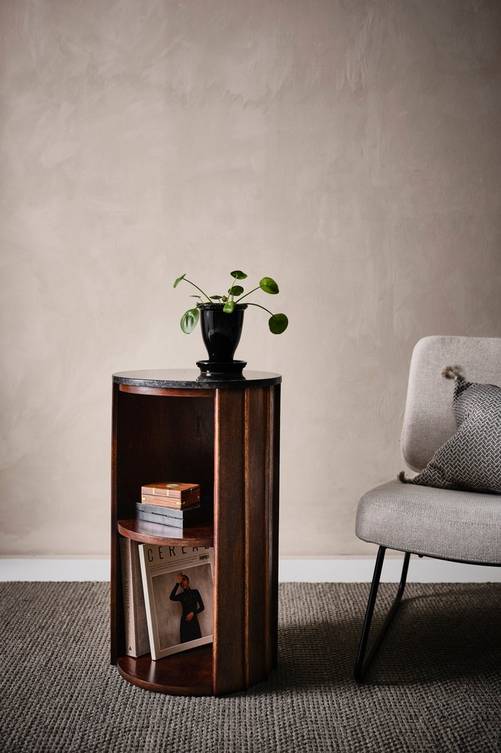 Sidobord med stomme av mangoträ och bordsskiva av granit. Ett praktiskt och stilrent sidobord med flera förvaringsmöjligheter. Material: Trä och granit. Storlek: Höjd 70 cm, bordsskiva ø 40 cm. Skötselråd: Torkas av med lätt fuktad trasa och fönsterputs.