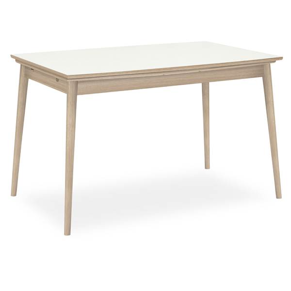 Matbord, med holländskt utdrag, med 2 iläggsskivor. Utdraget mått 222 cm, . . – 101 White HPL laminat, kant i vitpigmenterad mattlackad ek och ben massiv vitpigmenterad mattlackerad ek