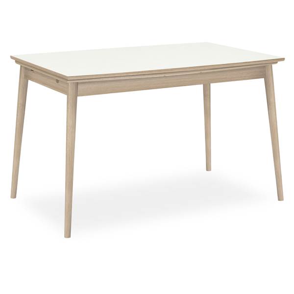 Matbord, med holländskt utdrag, med 2 iläggsskivor. Utdraget mått 222 cm, . . – 201 Bianco nanolaminat, kant i vitpigmenterad mattlackad ek och ben massiv vitpigmenterad mattlackerad ek