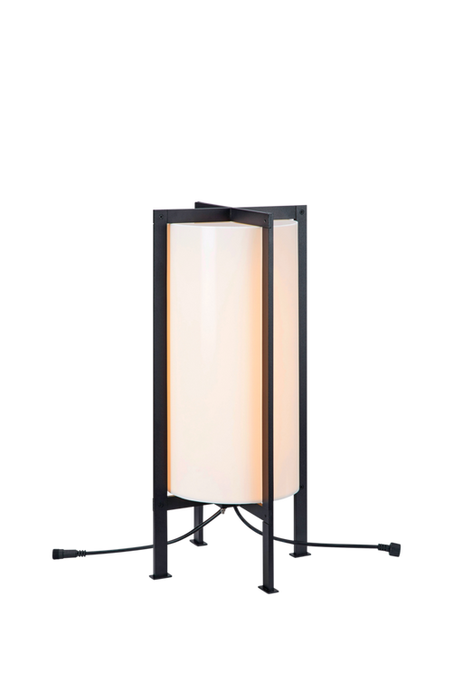Cylinderformad utomhuslampa i enkel design av svart metall med skärm av vit plast. Lampan har en inbyggd dimmer för att kunna anpassas efter kvällens mörker. Passar perfekt för att ge din trädgård en smickrande belysning. Transformator säljs separat. Material: Metall och krom. Storlek: Total höjd 54 cm, bredd 25,5 cm, djup 25,5 cm. Sockel/lampa: LED. Formgivare: Monika Mulder.