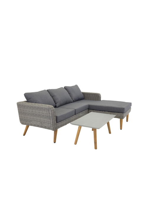 Nättare divansoffa i en konstrotting med dynor samt ben i akacia. Bordet har en skiva av betongmix. Mått: 205*182*H65