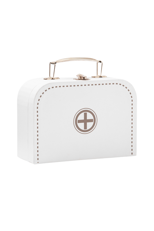 Fin doktorsväska Väskan innehåller, stetoskop, utdragbar termometer, tungspatel, pillerburk, salva, utdragbar spruta och reflexhammare. Det är kanske inte så konstigt att många barn gillar att leka doktor eftersom de besöker en doktor eller sjuksyster många gånger under sin uppväxt och gärna själva vill lyssna på hjärtat och ta hand om sjuka gosedjur. – Mått 20 x 14 x 8cm – Material: Papp + Bok/schima – Ålder: Från 3 år