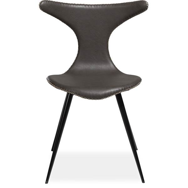 matstol, maxbelastning 120 kg och siddehøjde 48 cm. – Sits i vintage grått konstläder, med kontrastfärgade sömmar och runda ben i svartlackerad metall