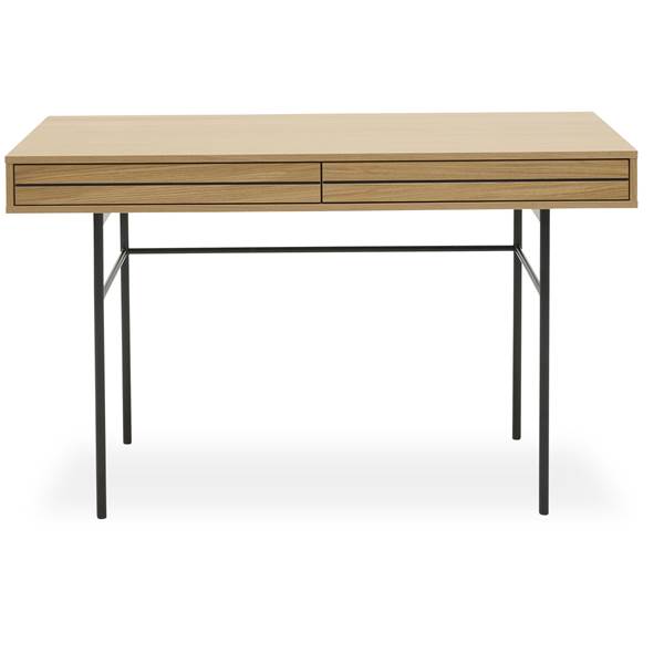 Skrivbord, 2 lådor. – Ovandel i mattlackerad ekfanér och ben i svart pulverlackerad metall