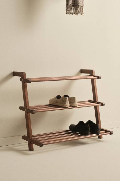 Skohylla av FSC-certifierad furu. Denna väggmonterade skohyllan är i stilren, nordisk design med tre hyllor för skor. Modellen är praktisk då skohyllan står på golvet och monteras mot väggen i överkant. Väggfästena är dolda så du får snygg montering. Viss montering krävs. Produkten är certifierad med FSC vilket innebär att den består av trä som är avverkat från ett ansvarsfullt skogsbruk som tar hänsyn till människor och miljö. Material: Furu. Storlek: Höjd 65 cm, bredd 80 cm, djup 42 cm. Hylldjup nederst 30 cm, mitten 22,5 cm, överst 15 cm. Skötselråd: Torkas av med lätt fuktad trasa. Tips/råd: Skapa ordning i din hall och komplettera med en praktisk klädhängare.