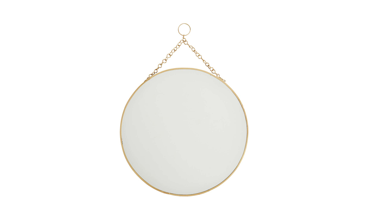 Elsa är en stilren och elegant väggspegel från Madam Stoltz. Den runda spegeln har en tunn ram i mässingsfärgat stål och en kedja för upphängning. Design & egenskaperRund spegel med mässingsfärgad ram.Tillverkad i stål.Leverans & förpackningLevereras monterad.Antal förpackningar: 1 stVikt: 0,5 kg