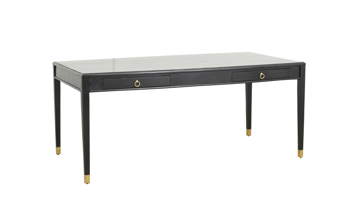 Detta är ett elegant skrivbord som både är praktiskt och skapar en känsla av lyx. Under bordsskivan finns två lådor som öppnas med dekorativa handtag i mässing. Ems drar tankarna till antik design men utför den med modern touch.Design & egenskaperElegant skrivbord med två lådor och detaljer i mässing.Tillverkad av mangoträ, MDF och mässing.Passar fint i hemmakontoret.Leverans & förpackningLevereras monterad.Antal förpackningar: 1 st.Vikt: 45 kg