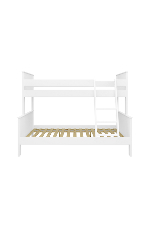 En våningssäng för hela familjen, med tillhörande stege (kan placeras båda L + R) tillverkad i lackerad MDF med massiva tallrallar. Madrassstorlek: 120×200 cm + 90×200 cm (madrass ingår inte). Enkel självmontering.