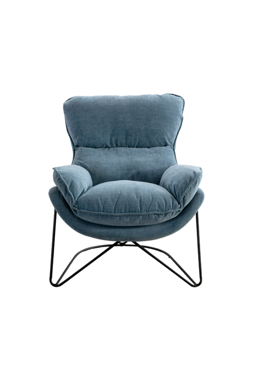 Fåtölj i tyg med lackat metallunderrede. Bredd 76 cm, djup 89 cm och höjd 86 cm.