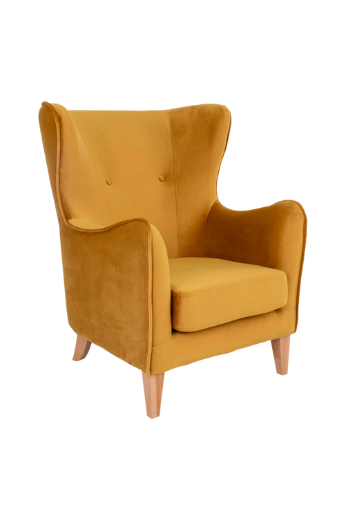 Fåtölj i sammet, ben i natur. Ej monterad. 87x87x103. 18.2kg