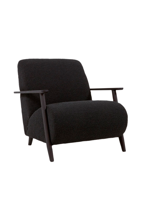 Karmstol med stoppning och textilklädsel. Armstöd av massiv ask med wenge-finish.