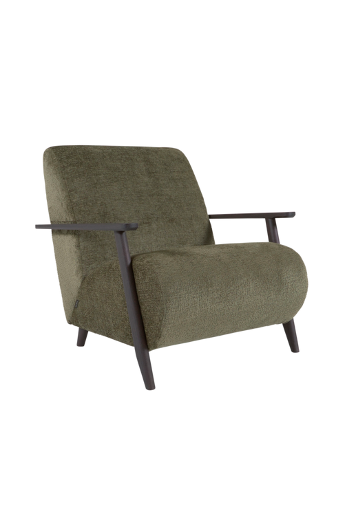 Karmstol med stoppning och textilklädsel. Armstöd av massiv ask med wenge-finish.
