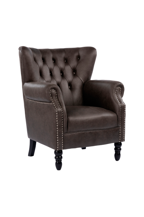 Fåtölj i tyg med dekorspikar för den rätta vintage känslan. Ben i lackat gummiträ. Konstläder.