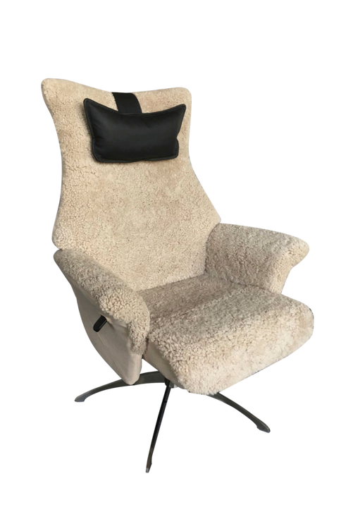 Fåtöljen för dig som vill njuta, den har en bra sittkomfort med ställbar rygg i olika lägen, vilket gör att du nästan kan ligga i den. Absolut en av marknadens snyggaste fåtöljer. Med topp klass fårskinns läder från Australien/ Nya Zealand, bak rygg samt utsida armstöd har matchande tyg, nackkudde är i svart skinn, till detta en fot med 5 ben i en riktigt snygg kromad design Produktinformation. Höjd: 120cm Bredd: 83 cm Djup: 82 cm Sitt höjd 48 cm Sitt bredd 47 cm Sitt djup 52 cm Material: Tyg/fårskinn/ Skinn/Stålram. Färg: Sand/ krom/Svart. Vi garanterar en vikt på 110 kg i stolen