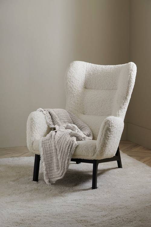 Fåtölj med stomme i massiv ask och yttertyg i fårskinnsimitation av polyester.